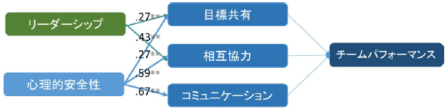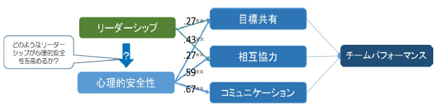 単純相関では、課題遂行リーダーシップを含め三つの項目に正の相関が見られた。一方で、回帰分析の結果では、対人関係リーダーシップは+.48の反面、課題遂行リーダーシップは-.37となっている。これらは、対人関係・変革型リーダーシップが低く、課題遂行リーダーシップが強い、いわゆるP型リーダーの下では、心理的安全性が高まらないということを示している。