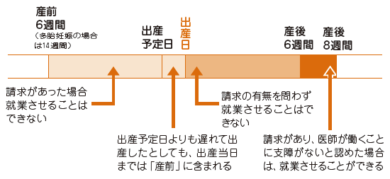 6週間(多胎妊娠の場合には14週間)以内に出産する予定の女性が休業(産前休業)を請求した場合、使用者はこの労働者を働かせることはできません(女性から請求がない限り、働かせることは可能です)。