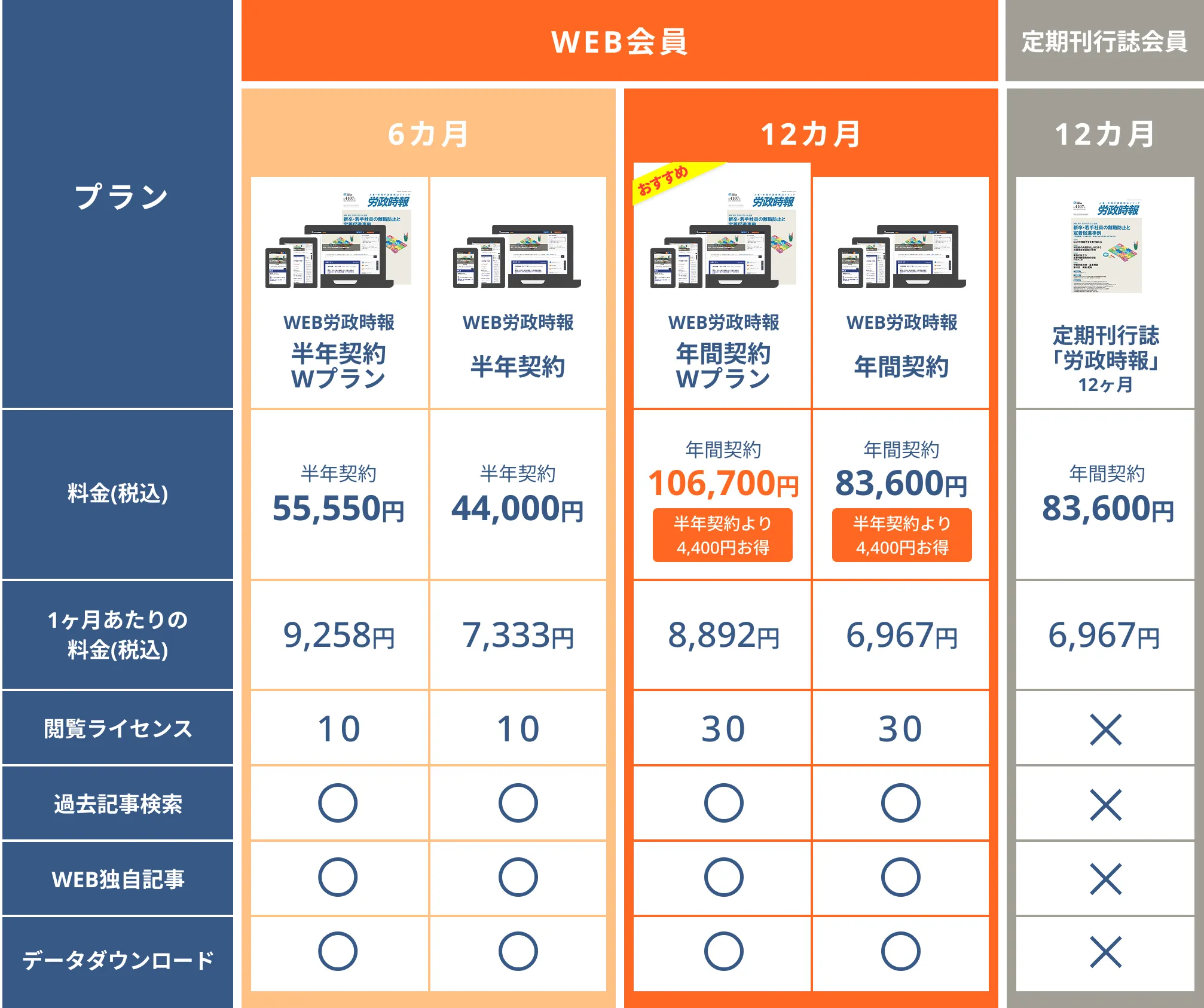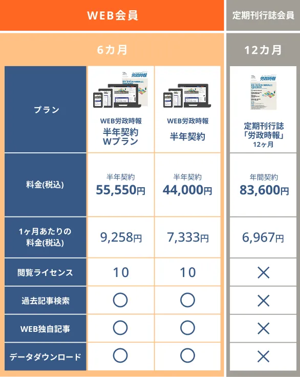 | WEB労政時報 半年契約Wプラン | 6カ月 | WEB会員 | 55,550円/半年契約 | 9,258円 | 10 |