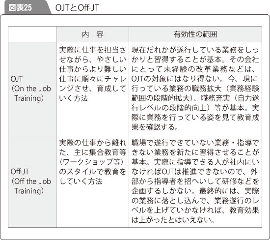 育成場面の違いに着目すると、OJTとOff -JTの2つに分かれます(図表25参照)。