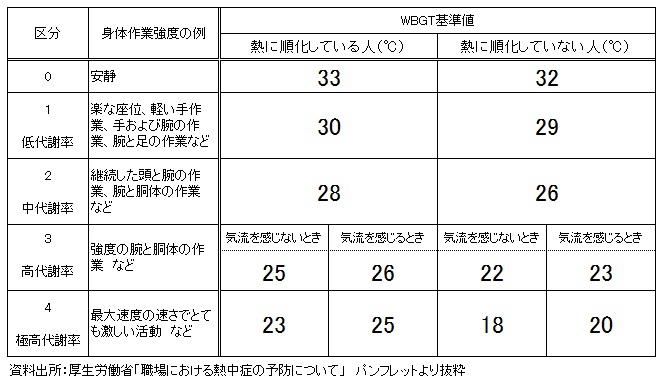 WBGT基準値は、身体作業強度等に応じて、下表のとおり設定されている。