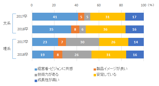 まずは、「会社の魅力」として重視するポイントです[図表6]。文系では、昨年は「経営者・ビジョンに共感」が41%でトップ、次いで「安定している」が31%でしたが、今年は僅差ではありますが「安定している」が36%でトップ、次いで「経営者・ビジョンに共感」が35%という結果になりました。理系でも、昨年は「技術力がある」が30%でトップ、次いで「安定している」26%という順位でしたが、今年は「安定している」が31%でトップに躍り出て、「技術力がある」が26%で2位に落ちてしまいました。文理ともに「安定している」がトップになるという、大手企業志向に通じる結果になっています。