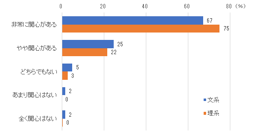 まず、関心度については、文系の92%が「関心がある」(「非常に関心がある」と「やや関心がある」の合計、以下同じ)と回答し、「関心がない」(「全く関心がない」と「あまり関心がない」の合計、以下同じ)と回答した学生はわずか4%です[図表5]。理系に至っては「関心がある」は97%に達し、「関心がない」はほぼ皆無(0.4%)となっています。学生が入社後の自分をイメージするためにも、現社員の実際の働き方に関心があるのは当然のことですが、ここまで関心が高いとは驚きます。