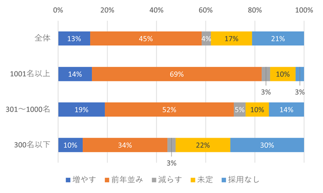 まずは、2026年卒採用の計画数について前年との比較を聞いたところ、全体では「前年並み」が45%で最も多く、「未定」や「採用なし」がそれぞれ17%、21%あるものの、「減らす」が4%であるのに対し「増やす」は13%と、依然として「増やす」が「減らす」を上回る傾向は今年も変わっていません[図表1]。