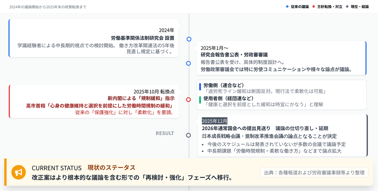 しかし、高市首相の指示により、この構図に大きな変化が生じた。当初は中長期的な課題として先送りされていた労働時間制度の再検討や裁量労働制の適用拡大などの重要論点が、前倒しで検討対象に加わったのである。