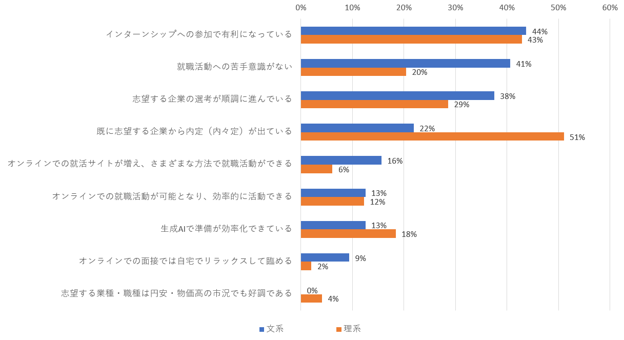 一方、理系はというと、トップは「既に志望する企業から内定(内々定)が出ている」で51%と半数を超え、次いで「インターンシップへの参加で有利になっている」が43%で続きます。文系では、「有利になっている」「順調に進んでいる」といった感覚的な理由にとどまっていたのに対して、理系では「内定(内々定)が出ている」という確かなエビデンスが既にあり、それが “楽観” に通じていると考えられます。文系・理系間で生じているこの違いは大きいです。