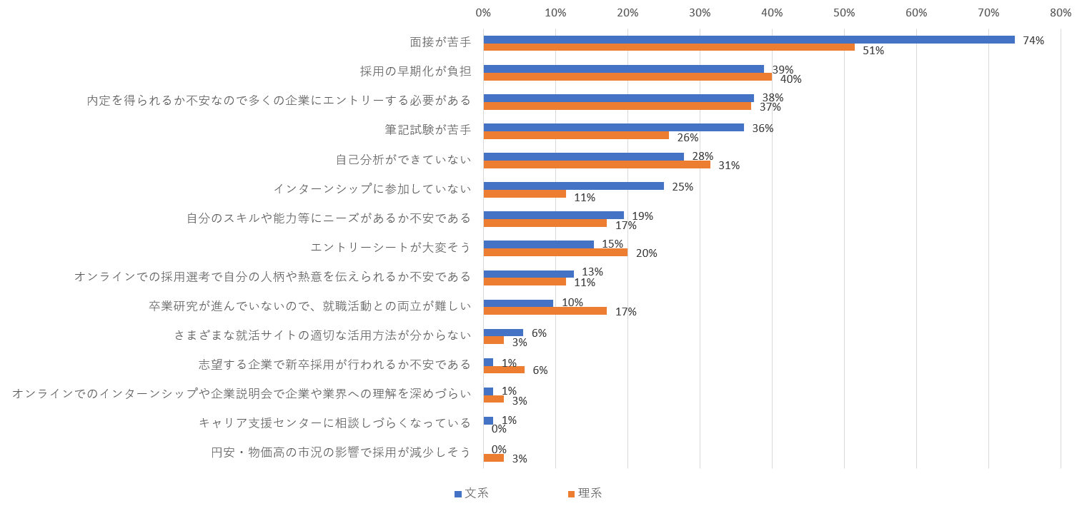 「面接が苦手」以外で文系・理系でポイント差が見られる項目では、前回に続き「筆記試験が苦手」(文系36%、理系26%)において、文系のほうが10ポイント高くなっています(前回は文系38%、理系28%)。一方、「エントリーシートが大変そう」(文系15%、理系20%)と「卒業研究が進んでいないので、就職活動との両立が難しい」(文系10%、理系17%)では、理系のほうが5~7ポイント上回っています。前回は、「エントリーシートが大変そう」と回答する割合は文系のほうが高かったものの(文系26%、理系17%)、今回は異なっています。理系は、エントリーシートに自身の研究課題に関する内容の記載を求められることもあるのに対して、文系にはあまりそのような項目はなく、近時は生成AIのサポートを受けることで、エントリーシート作成の負担が軽減しているのかもしれません。