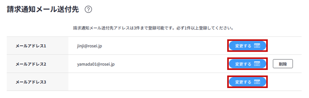 現在の請求通知メール送付先の登録状況を確認し、メールアドレスを追加・変更する場合は「変更する」ボタンを押すと、メールアドレス入力画面が表示されます。